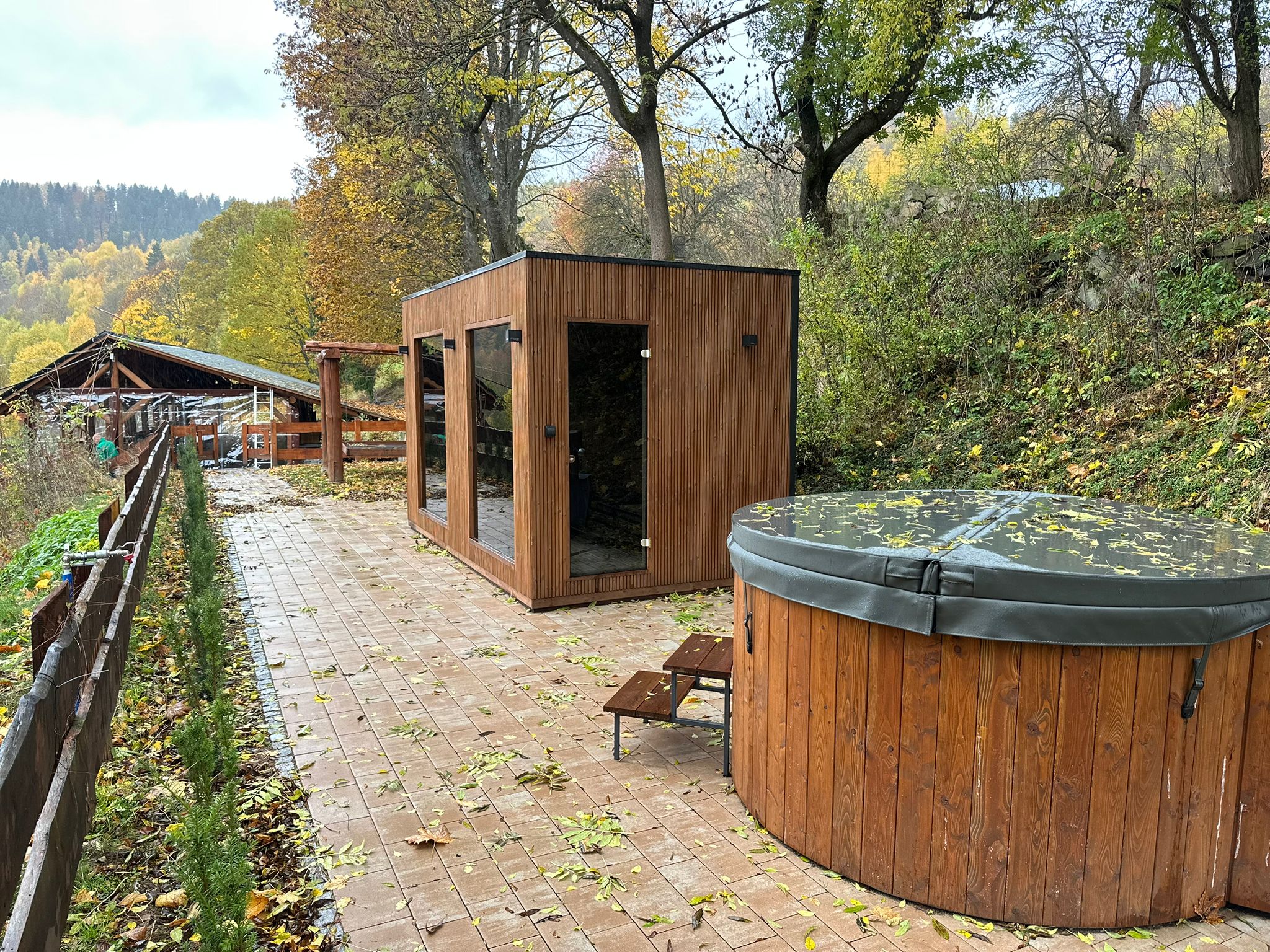 Balia z podgrzewaną wodą (jacuzzi) – idealna do kąpieli pod gołym niebem, zarówno po intensywnym dniu w górach, jak i wieczornym relaksie przy zachodzie słońca.